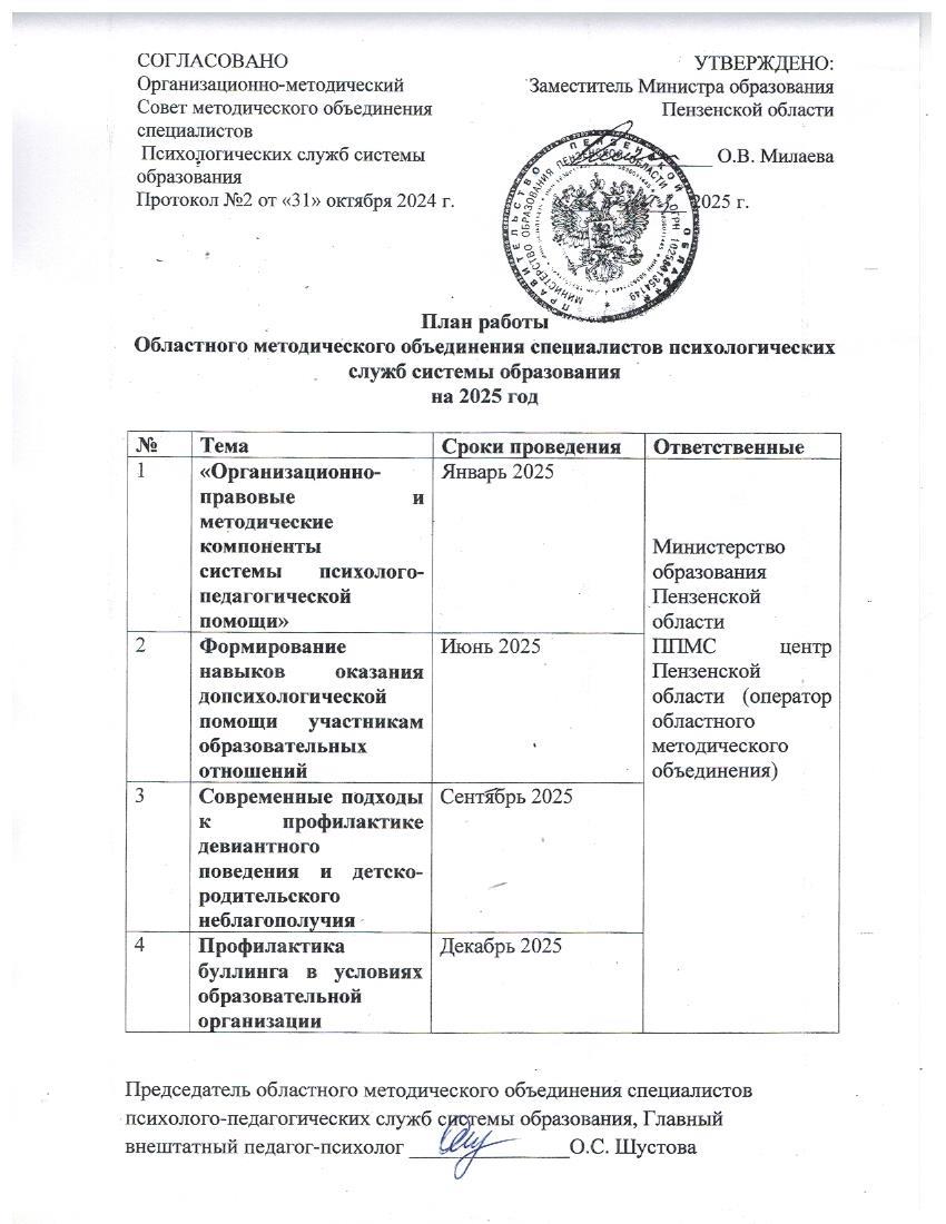 План работы Областного методического объединения специалистов психологических служб системы образования на 2025 год